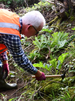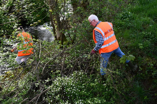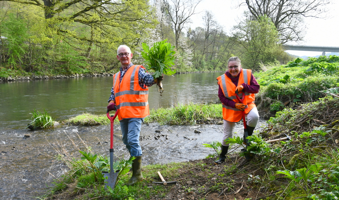 Etwa 30 Personen zählt das Team, das dem Gewächs ehrenamtlich in der Freizeit ein wenig Einhalt gebieten will.„Wir teilen uns meist in mehrere Abschnitte auf“, sagte Buresch und berichtete über verschiedene Bereiche entlang der hiesigen Fließgewässer, wo sich die Staude bereits großflächig angesiedelt hat. „Wenn wir diesen frühen Zeitpunkt des Ausstechens nicht erwischt haben, kommt die Sense zum Einsatz“, berichtete Lebensgefährtin Almut Mayer, „und wenn es trotzdem zur Blüte kommen sollte, dann werden die Dolden mit den Samen abgepflückt und entsorgt. Das sind unsere drei Stufen. Hauptsache, eine Vermehrung und Verbreitung wird verhindert.“ Beim Sensen gelte nochmal besondere Vorsicht, hier sollte man nicht mit Schutzkleidung sparen.