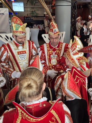 Wie bereits in den Vorjahren wurden die Kinder darauf vorbereitet, dass vom bloßen Händeschütteln über Small Talk bis zur Ordensverleihung alles möglich sei. Wie sich kurz darauf zeigte, hatte eine weitere Gesellschaft eine Audienz, denn das Dreigestirn der Karnevalsgesellschaft Ahrweiler stand ebenfalls im Foyer und sorgte so für leichte Verwirrung bei den jungen Oberbergern. Doch schnell war für Klarheit gesorgt und untereinander wurden Orden und Sticker getauscht. Mit Kinderprinzessin Helena und ihrer Adjutantin Lucie war auch der jecke Nachwuchs aus Ahrweiler vertreten, so dass erste Gruppenbilder entstehen konnten.