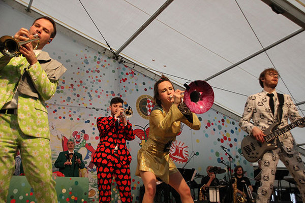 [Die bunt gekleideten Jungs und zwei Mädels der Performance Band Druckluft verwandelte das Festzelt in einen wahren Hexenkessel und niemanden mehr hielt es auf den Stühlen.]