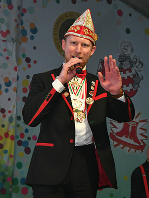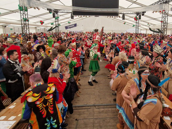 Heimspiel und emotionaler Abschied dreier Mitglieder beim Tanzkorps Rot-Weiss, die sich zum letzten Auftritt der Session wieder etwas Besonderes ausgedacht hatten. Nicht nur der Einmarsch klang anders, beim ersten Tanz sah man plötzlich Jungfrau Mirjam als „Tanzmarie“ im Handsitz in der hinteren Reihe. Das Zelt feierte die Aktion, die quirlige Jungfrau ist nun mal für jeden Spaß zu haben. Bis kurz vor dem Auftritt der Truppe war es noch ungewiss, doch schließlich gab es ein Dankeschön von Technow, bei dem ein paar Tränchen auf und vor der Bühne kullerten. Die Mariechen Kristin und Leonie sowie Tanzoffizier Kevin beenden das Tanzen. Das Trio hatte viele Jahre mit „Rut-Wiess“ auf der Bühne gestanden. Aber wie Technow vorab schon sagte: „Einmal Rut-Wiess, immer Rut-Wiess!“