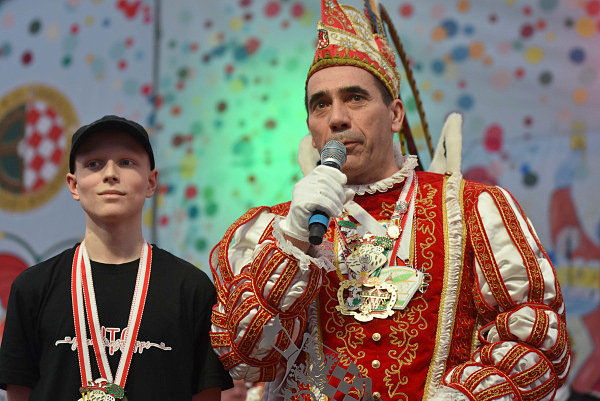 Kaum waren die Tore geöffnet, strömte das feierfreudige Volk ins Zelt. „Wir sind komplett ausverkauft“, freute sich der 1. Vorsitzende der KG, Michael Peffeköver. Zum Start zog der Kinderelferrat mit den Pänz der Garde und der Jugendtanzgruppe, den großen Elferrat und das Dreigestirn mit seinem Schmölzchen im Schlepptau, auf die Bühne. Sitzungspräsident Daniel Technow stellte die Tollitäten vor, die sich aber zunächst zurückzogen und dem Nachwuchs den Vortritt ließen. Die jungen Tänzer beider Gruppen gaben je einen Tanz zum Besten, bevor Kinderprinz Ben I. mit Prinzessin Lena die Jecken begeisterte. Wieder auf dem Weg der Besserung befindet sich nach einer Erkrankung Jan Klein von der Jugendtanzgruppe, weshalb er länger aussetzen musste. Unter einem Riesenapplaus des Publikums überreichten das Kinderprinzenpaar und das Dreigestirn ihm jeweils den Sessionsorden, verbunden mit herzlichen Genesungswünschen.