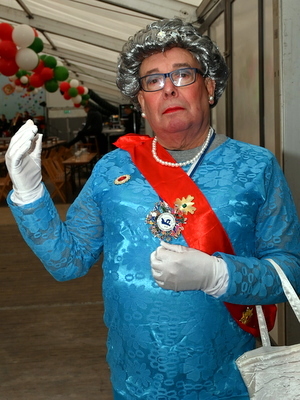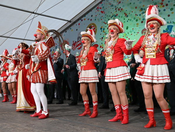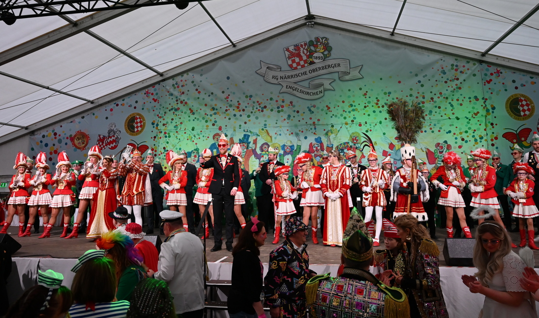 Neben Bürgermeister Lukas Miebach und Gattin waren auch sein Vorgänger Dr. Gero Karthaus sowie Landrat Klaus Grootens unter den Gästen an diesem Tag. Tapetenwechsel, die nächste Band klopfte an. Mit den "Klüngelköpp" macht man nie was falsch, sie starteten direkt mit „Niemols ohne Alaaf“. Auch hier war sofort die Bühne belagert und die Stimmung gipfelte bei „Bella Ciao“ und beim neuen Hit „Cést la vie“ gab's eine Ladung Konfetti, teilweise auch ins Kölschglas. Mitmach-Workout war angesagt bei der Rhythmussportgruppe, einer Vollgas-Brass-Poptruppe aus Köln und Düsseldorf. Songs wie „Rheinfeiern“, „Meine Freunde“, „Bisschen Euphorisch“ oder „Kein Kölsch“ hatte man bestimmt schon im Ohr. Wohnzimmer-Feeling brachte auch das VfL-Ballett mit, das gewohnt kreischend und rockschwingend die Bühne eroberte, wo im Cancan-Stil zu Stimmungshits die Beine in die Höhe geworfen wurde. So langsam ging es für die Familien-Karnevalssause in den Endspurt.
