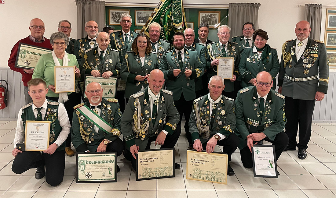 Nach dem offiziellen Teil und einem gemeinsamen Essen führte Anja Linke, unterstützt durch den ehemaligen Geschäftsführer Erik Scheurer, dem nun frisch gewählten Geschäftsführer Tom Fielenbach, dem Bezirksbundesmeister Ernst-Guido Janßen, dem Präses Norbert Huthmacher und der Königin Denise Meister die Ehrungen und Beförderungen durch (siehe Kasten).