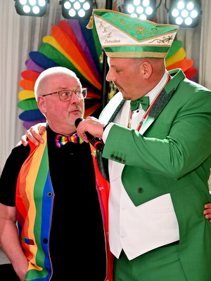 [„Biste jood drupp ?“: Der Sitzungspräsident prüfte vor Beginn der Veranstaltung den ordnungsgemäßen Zustand des jecken Publikums.]