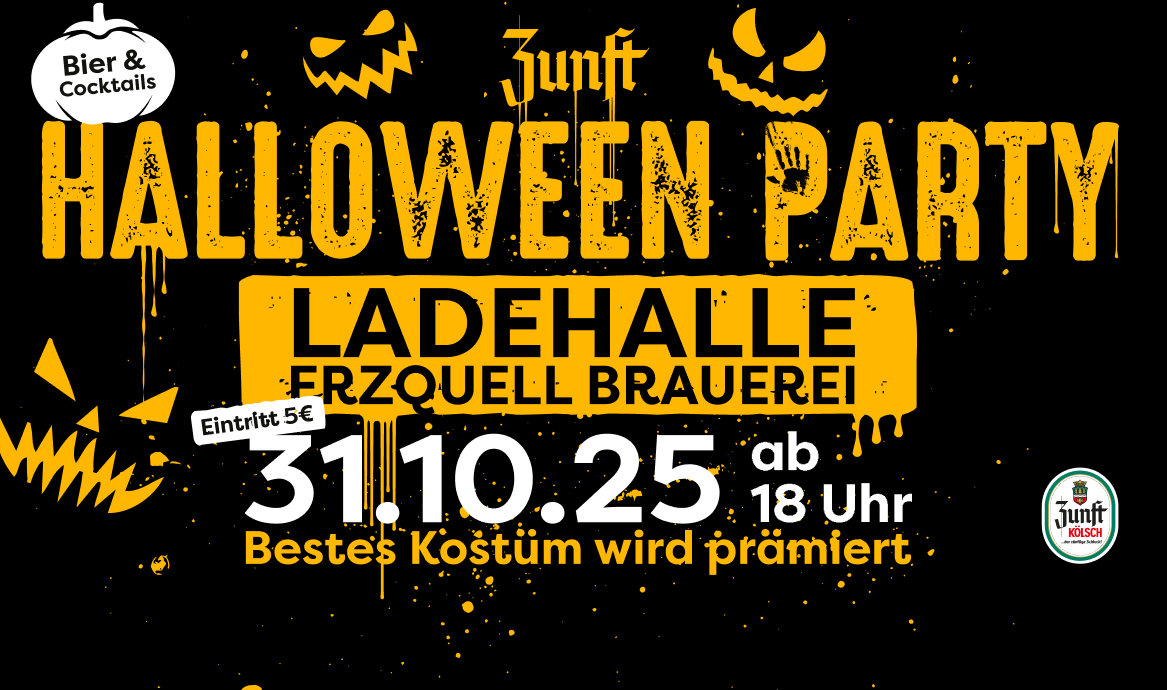 Die Erzquell Brauerei lädt ein zur ersten ZUNFT Halloween Party! Wo sonst traditionell die legendäre Rosenmontagsparty stattfindet, öffnet sich an Halloween die Tür zu einer völlig neuen Brauerei-Erfahrung. Am Freitag, den 31. Oktober 2025 ab 18 Uhr, wird in der bekannten Ladehalle der Brauerei nicht verladen, sondern gefeiert – und zwar ordentlich: gruselig, gesellig und mit Zunft Kölsch frisch aus der Brauerei. Der Eintritt kostet 5 Euro, dafür gibt es echtes Brauerei-Feeling, stimmungsvolle Musik und Getränke direkt aus der Quelle: Zunft Kölsch frisch gezapft und hausgemachte Cocktails.