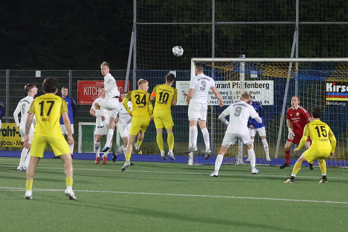 Distanzschüsse von Endenichs Abdendi Oubelkhiri und Brummenbaum rauschten knapp vorbei beziehungsweise drüber (30., 31.), Tom Geßner wehrte einen Freistoß von Ertugral Ünal ab (33.). Unmittelbar vor dem Pausenpfiff hatte Clemens genug Platz, um eine Maßflanke auf Brummenbaum zu annoncieren. Der Angreifer hielt den Kopf hin – 2:0!