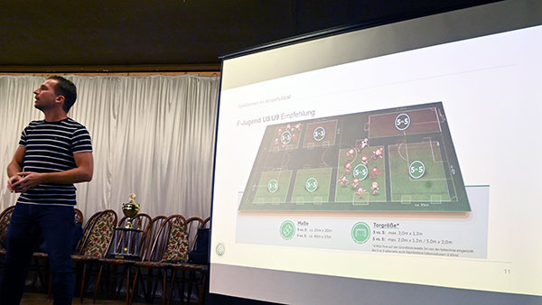 Während bei den A-, C-, D-, und F-Junioren die Zahlen nach oben gingen, nahmen diese bei den B-Junioren (-7), E-Junioren (-12) und Bambinis (-6) teils deutlich ab. Im Mädchenfußball reduzierte sich die Anzahl der gemeldeten Teams von 36 auf 29 Mannschaften. Um den Kindern auch künftig noch genügend Spielanteile zu garantieren, wurde die Aktion „Kinderfußball“ vom DFB ins Leben gerufen. Diese erfährt in den Kreisen Köln und Aachen schon regen Zuspruch, wie der geladene Referent Manuel Schulitz in seinem Vortag berichtete. „Es muss im Vordergrund stehen, dass jedes Kind spielt. Jeder soll spielen dürfen und nicht nur die Besten. Es geht darum, dass alle Kinder aktiv sind und nicht auf der Bank versauern oder erst gar nicht im Kader stehen“, führte der Verbandssportlehrer aus. Hierfür wurden neue Spielformen entwickelt.