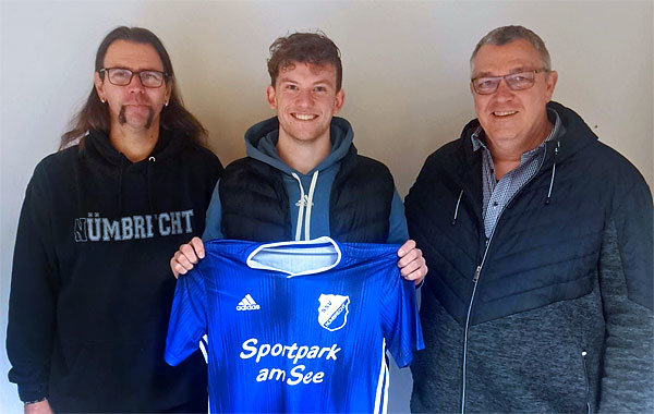 [Foto: SSV Homburg-Nümbrecht --- SSV-Vorsitzender Roger Lang (re.) und Trainer Torsten Reisewitz freuen sich über die Zusage von Neuzugang Niklas Goße.]