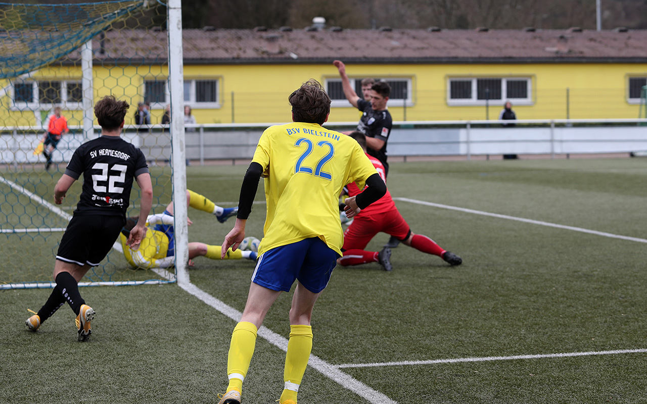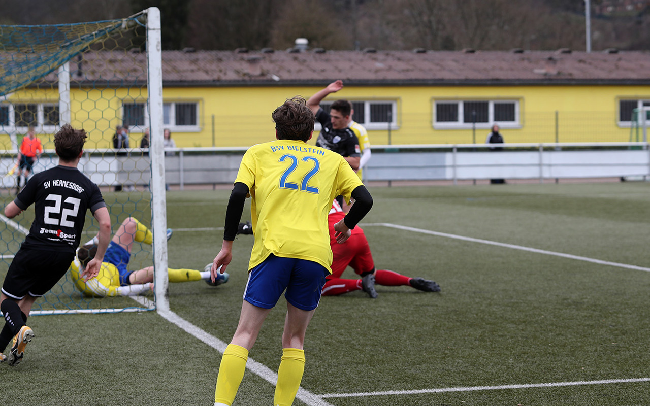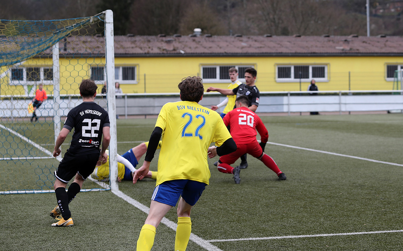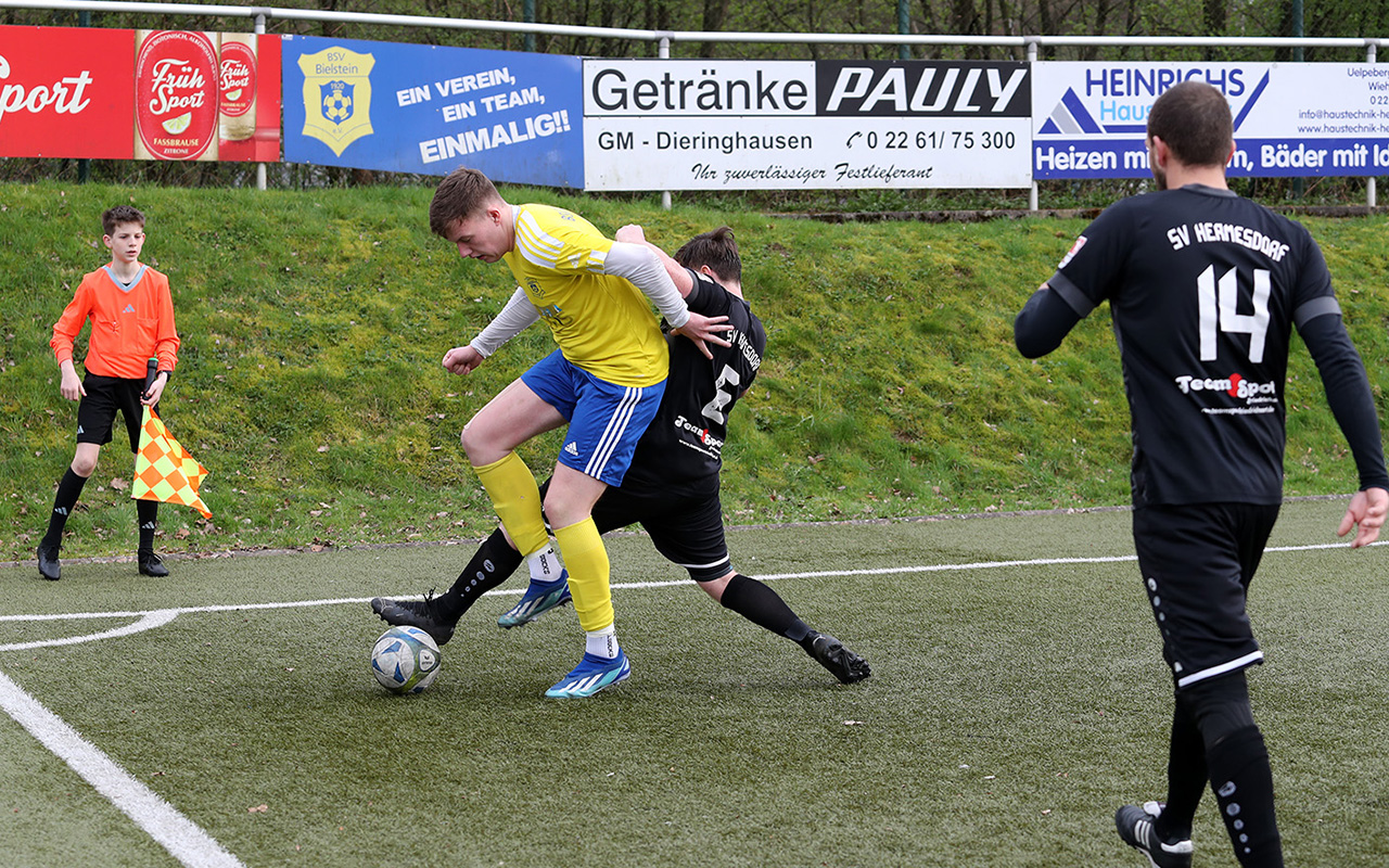 Für Hermesdorf gab es beim Auswärtsspiel gegen den favorisierten BSV Bielstein nichts zu holen. „Wir haben in den entscheidenden Momenten die falschen Entscheidungen getroffen und gegen einen so starken Gegner kann sowas dann schon einmal passieren“, relativierte SV-Spielertrainer Daniel Kelm das Resultat. Die Gäste hatten beim Stand von 3:1 die dicke Chance, auf 3:2 heranzukommen, ließen die gute Gelegenheit allerdings liegen. In der Folge zog Bielstein uneinholbar davon. „Wir haben gegen einen tiefstehenden Gegner immer wieder fußballerische Lösungen gefunden, deshalb bin ich sehr zufrieden mit der Leistung der Jungs“, freute sich BSV-Coach Sven Reuber.