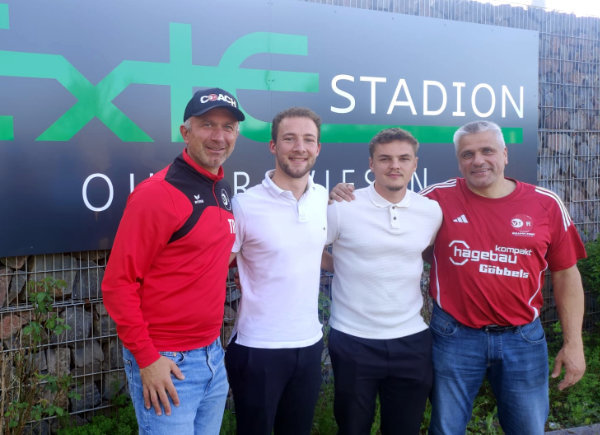 [Foto: VfR Wipperfürth --- Die Coaches Giovanni Bernardo (li.) und Norbert Scheider (re.) mit den Neuzugängen Enrico Maierle (2.v.re.) und Patrick Schmidt.]
