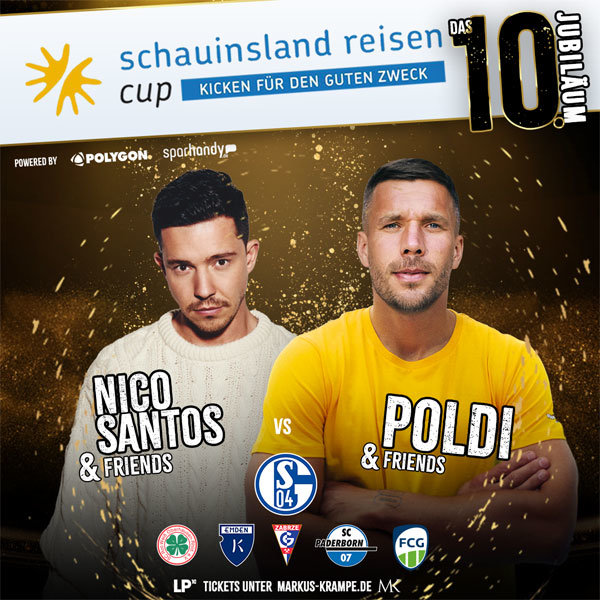 Die zehnte Jubiläumsauflage des schauinsland reisen Cup findet am Sonntag, 14. Januar 2024, in der SCHWALBE arena in Gummersbach statt. Veranstalter Markus Krampe und Schirmherr Lukas Podolski freuen sich auf die Teilnahme des FC Schalke 04. Der Zweitligist wird sicherlich viele Fans in die Halle locken. Die weiteren Teams sind der SC Paderborn (2. Bundesliga), „Poldis“ derzeitiger Klub Gornik Zabrze (1. Liga Polen), Rot-Weiß Oberhausen (Regionalliga West), Kickers Emden (Oberliga Niedersachsen) und der FC Gütersloh (Regionalliga West).
