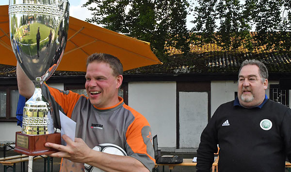 [Wiedenests David Stracke nahm den riesigen Siegerpokal von Alfons Arnoldy entgegen.]