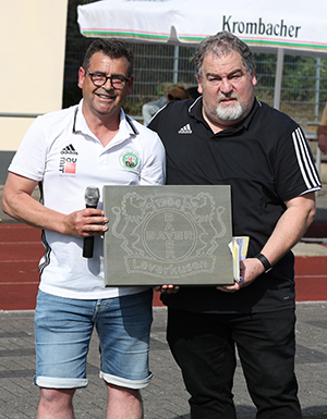 Eine Überraschung hatten die Mannschaften im Gepäck: Markus Günther (Abteilungsleiter der Alten Herren des TuS Lindlar) überreichte eine Platte aus Bergischer Grauwacke, in die das Logo von Arnoldys Lieblingsklub Bayer Leverkusen eingraviert ist. Die große Abschlussparty mit den vier Finalteams soll demnächst im Braustübchen der Erzquell Brauerei in Bielstein steigen.