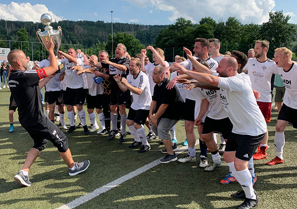 Seit dem letzten Titelgewinn Ende der 1990er-Jahre waren vier Finalanläufe nötig, damit der SSV Wildbergerhütte-Odenspiel die imposante Trophäe in die Höhe stemmen durfte. Entsprechend ausgelassen fiel der Jubel bei den Spielern, den zahlreich angereisten Fans und Trainer Guido Hochhard aus. „Wir sind der verdiente Sieger“, befand der Coach. Seine Equipe hatte auf dem Weg ins Endspiel unter anderem die Champions von 2018 und 2019, BV 09 Drabenderhöhe und DJK Dürscheid, ausgeschaltet. Nach den ersten Kaltschalen, die man sich in Derschlag genehmigte, endete die Feier vermutlich in der Bar des 1. Vorsitzenden Ludger Müller. Genauere Überlieferungen sind nicht bekannt.