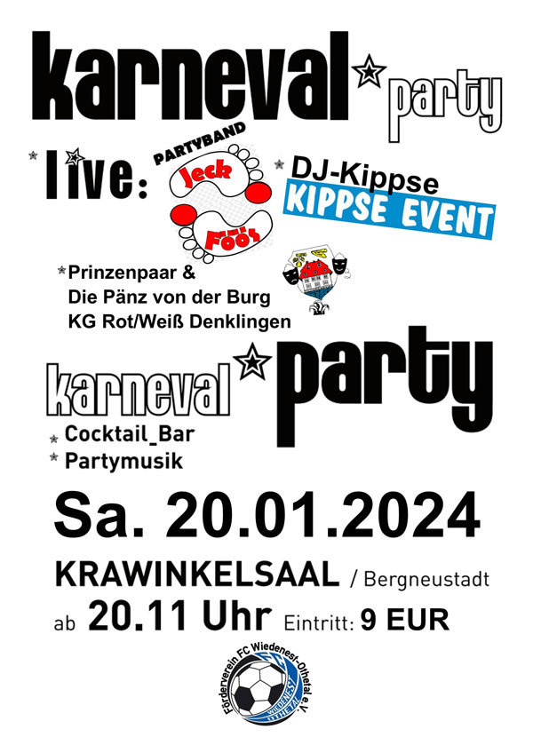 Abends lädt der Förderverein des FCWO zur 15. Karnevalsparty in den Krawinkelsaal in Bergneustadt ein. Für Unterhaltung sorgt die Band „Jeck Fööss“. Einen Auftritt hat zudem das Dreigestirn der KG Rot-Weiß Denklingen mitsamt "Pänz von der Burg". Einlass ist ab 20:11 Uhr. Karten zum Preis von 9 Euro sind ausschließlich an der Abendkasse erhältlich.