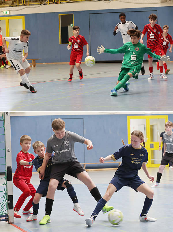 [Die U13 des FV Wiehl unterlag im Endspiel dem SV Bergisch Gladbach 09 (oberes Foto); im kleinen Finale gewann die JSG Homburg (graue Trikots) gegen den VfL Engelskirchen (unteres Foto).]