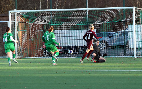 Bereits nach wenigen Sekunden hätte es im Kasten der Gäste klingeln können. Nach einem hohen Zuspiel herrschte Konfusion. Katharina Scharrenbroich zwang die herausgelaufene Keeperin Hannah Moll zu einem Pressschlag. Der Ball flog in Richtung des verwaisten Gehäuses, doch Jana Drews schlug die Kugel noch vor der Linie weg. Wenig später bediente Anisa Mekaoui über rechts die mitgelaufene Scharrenbroich, der Abschluss ging knapp vorbei (2.).