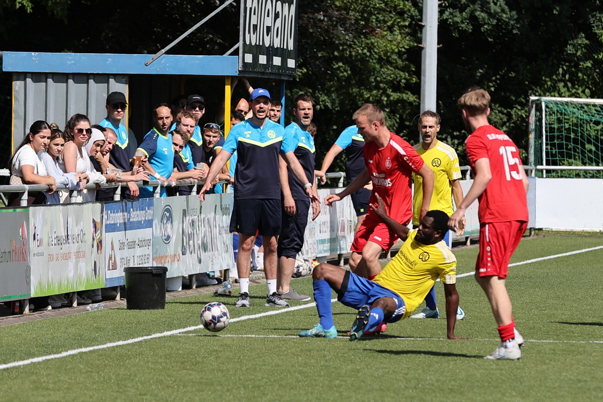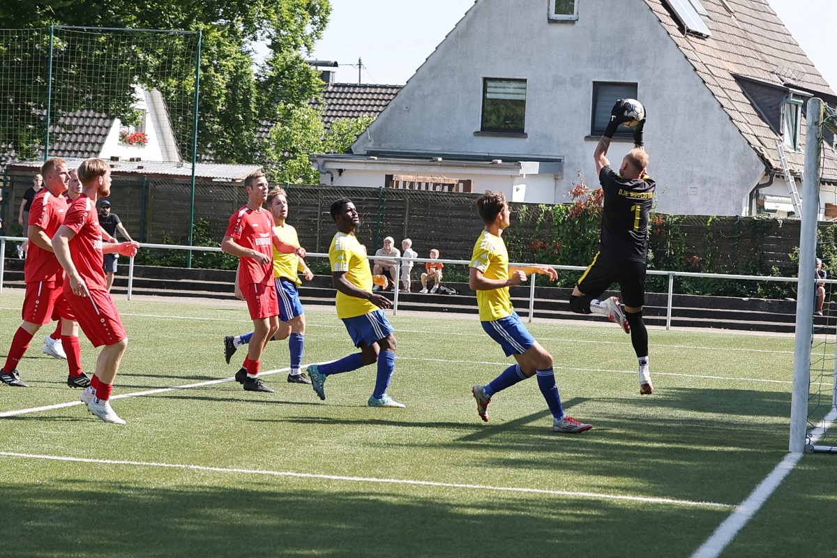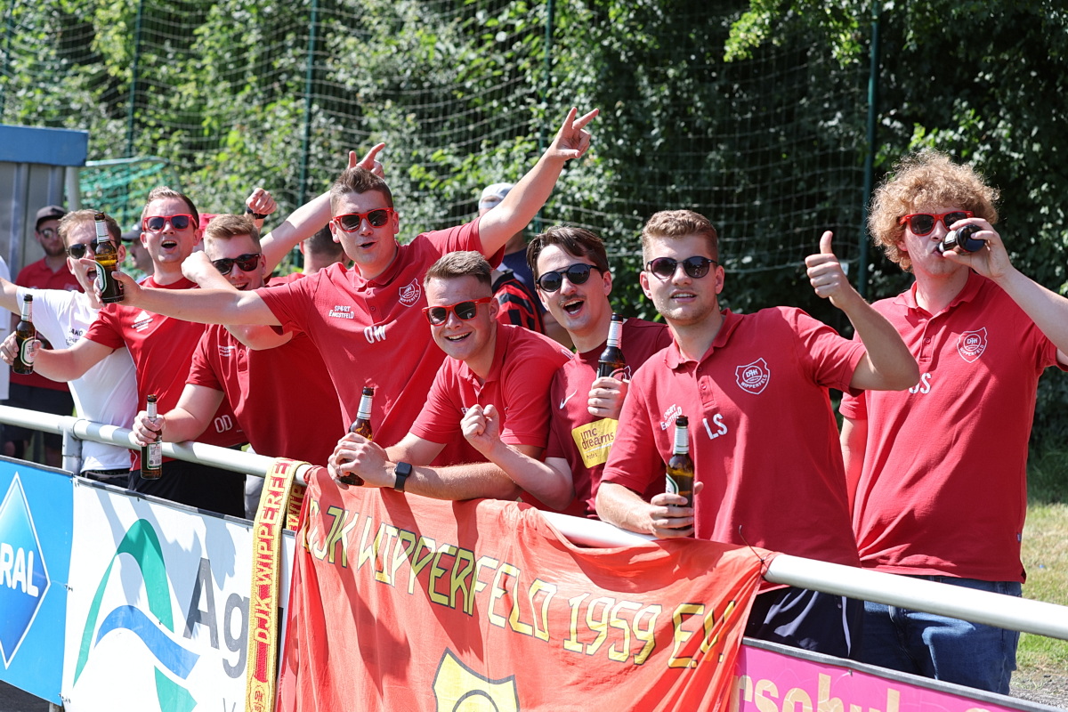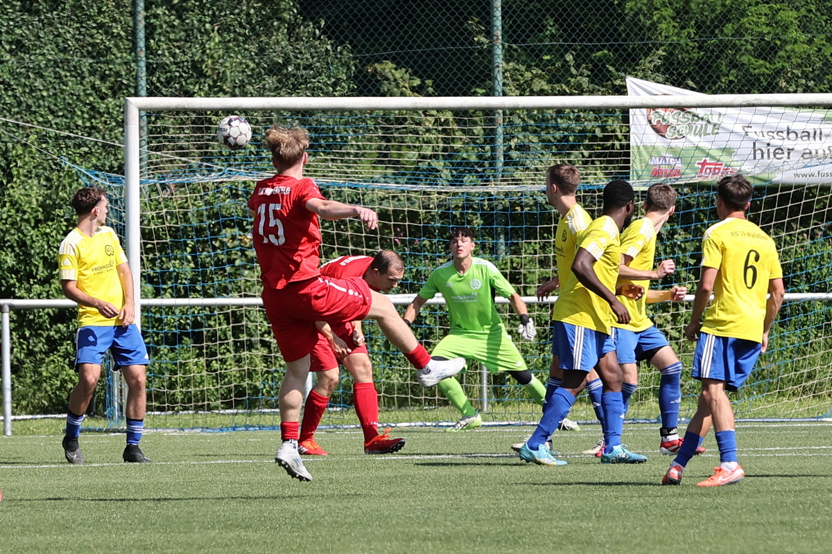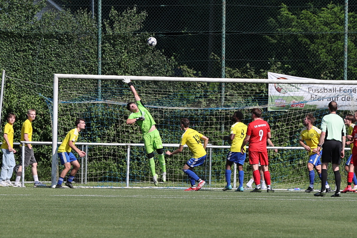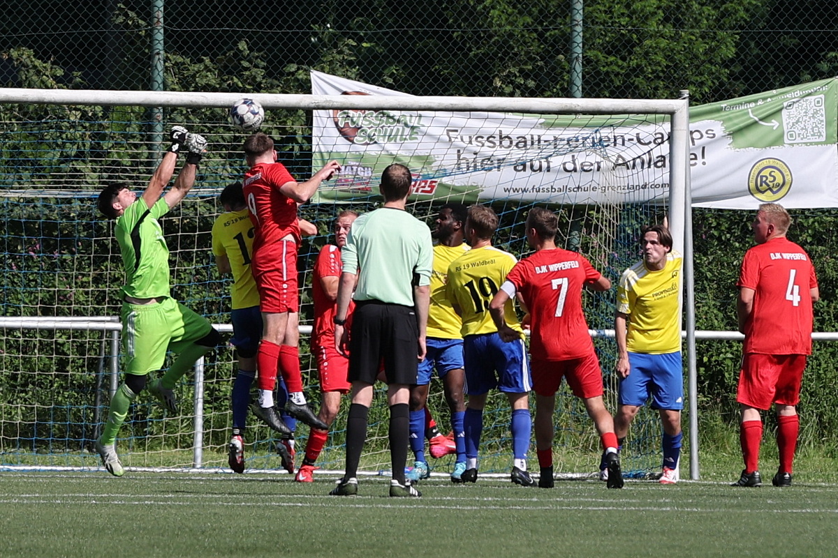 Im Duell der Kreisliga B-Vizemeister hieß die Devise – wie nicht anders zu erwarten war – „Safety First“. Bei brütender Hitze neutralisierten sich beide Teams, wobei die Hausherren den angriffslustigeren Eindruck hinterließen, ohne indes wirklich gefährlich werden. Erst nach einer Trinkpause wurde es in den Strafräumen interessant. Die erste nennenswerte Gelegenheit besaß Wipperfeld: Nach einer Flanke von Patrick Philipp kam Robert Hembach frei zum Kopfball, setzte die Kugel jedoch vorbei (29.).