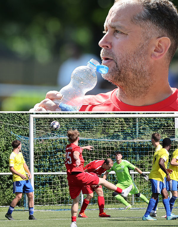[Angesichts der Temperaturen war das Spiel kein Zuckerschlecken, auch Wipperfelds Trainer Erkan Yorganci musste zur Wasserflasche greifen.]
