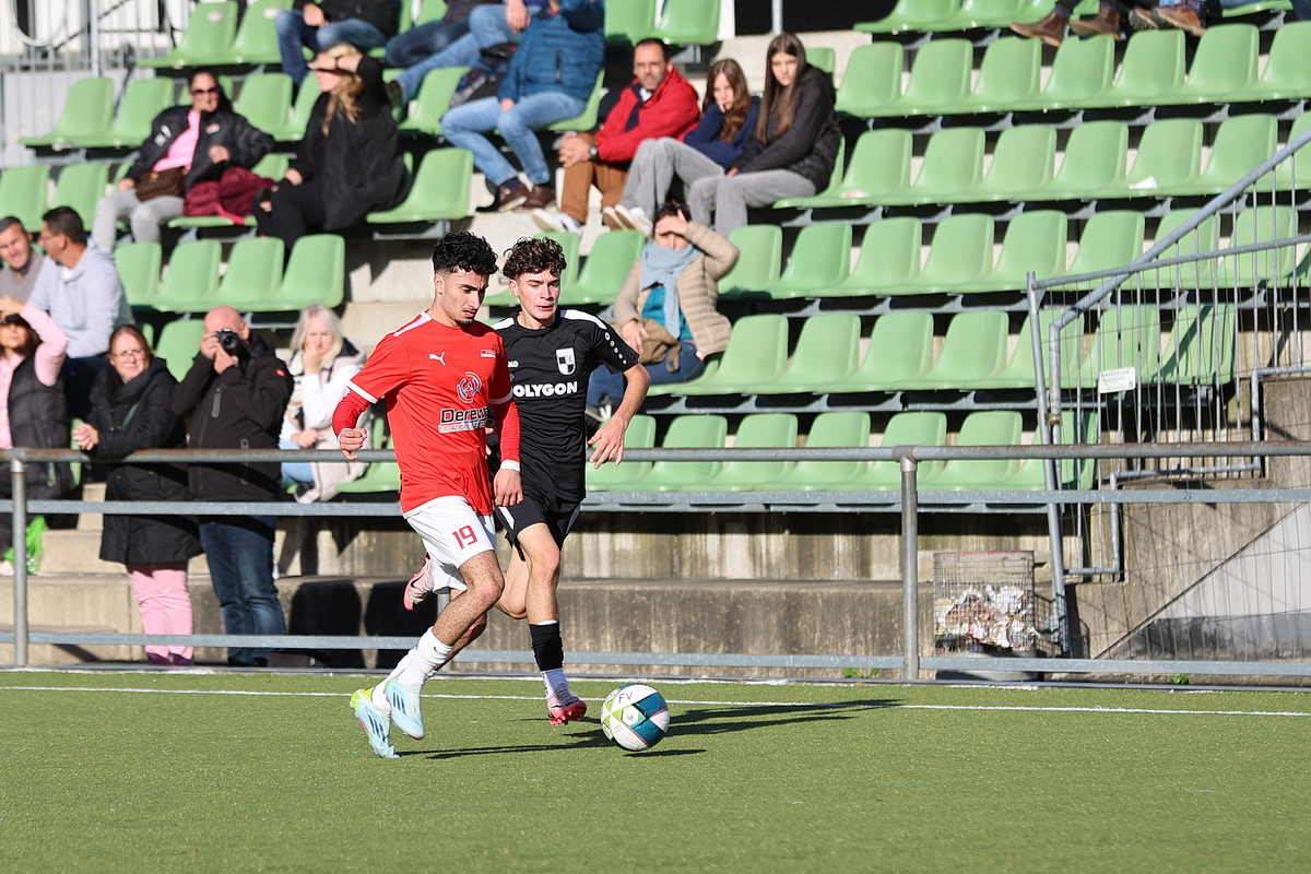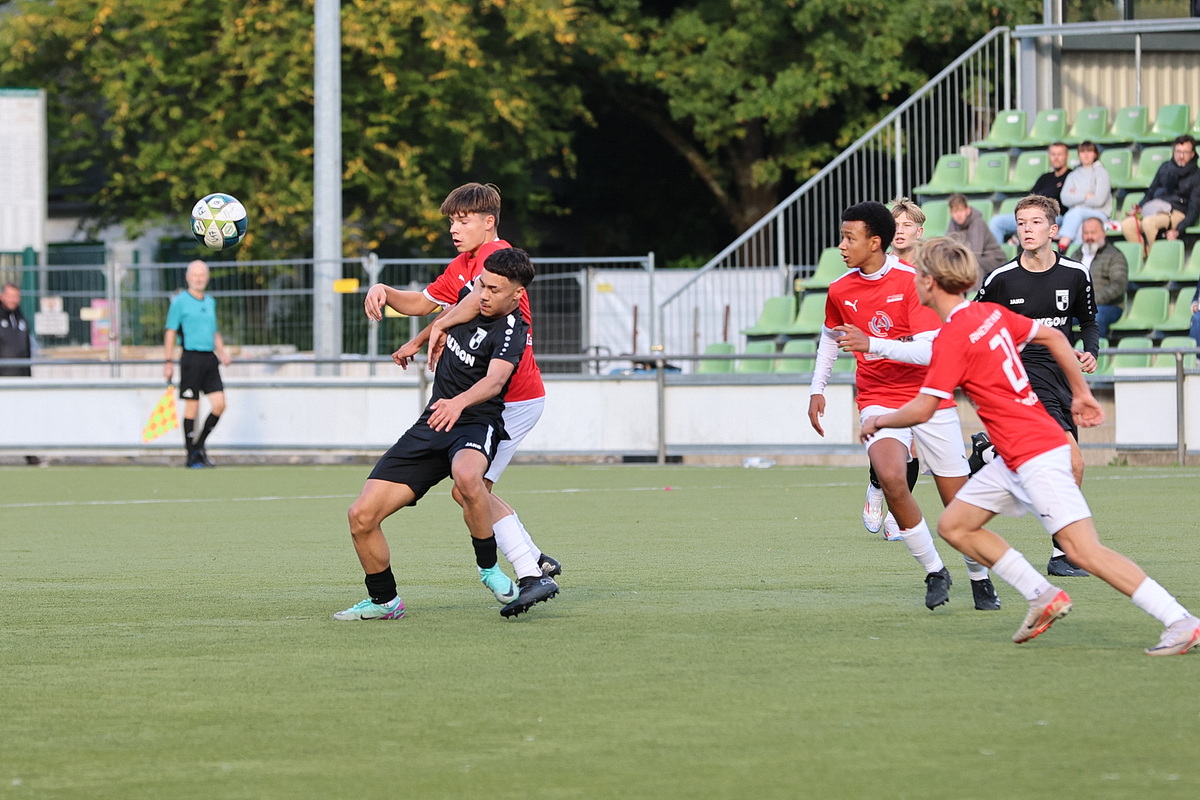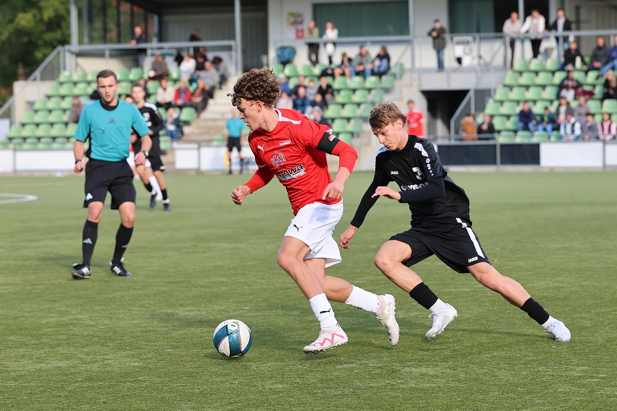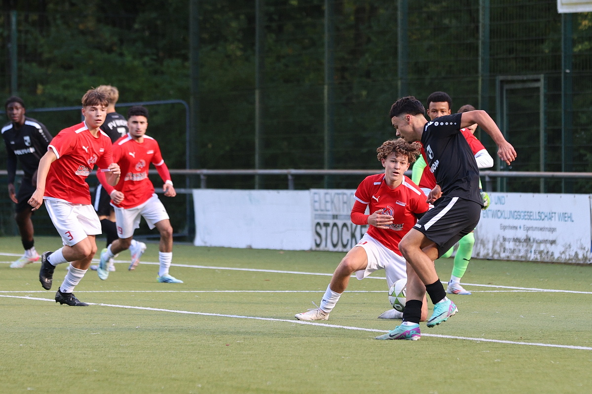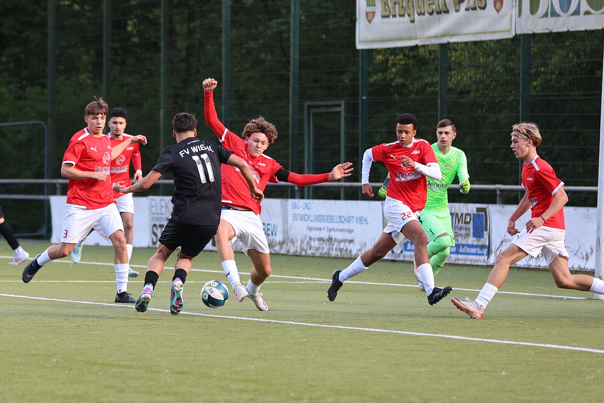 Extrem bittere Niederlage für die B-Junioren des FV Wiehl: Als sich beide Seiten schon mit einer Nullnummer angefreundet hatten, bekamen die Gäste, die zu dem Zeitpunkt wegen einer Fünf-Minuten-Strafe dezimiert waren, einen Freistoß zugesprochen. Der Schütze stellte das Visier scharf und jagte die Kugel aus 25 Metern Entfernung unhaltbar in den Knick. Arthur Allerdings besaß im direkten Gegenzug die Möglichkeit zum Ausgleich, scheiterte nach einem Freistoß von Kilian Vor aber am Rheinsüd-Torhüter, der genauso wie sein Pendant auf der anderen Seite, Ben Wirths, einen überragenden Tag erwischte.