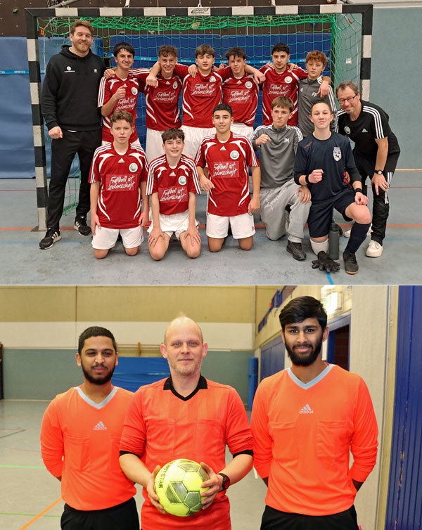 [Das Team aus Bonn (oberes Foto) gewann das Turnier, die Partien wurden von den Unparteiischen Neresh Pathmalingam, Sascha Janke und Lagsan Selvanayagam (unteres Foto v.li.) geleitet.]