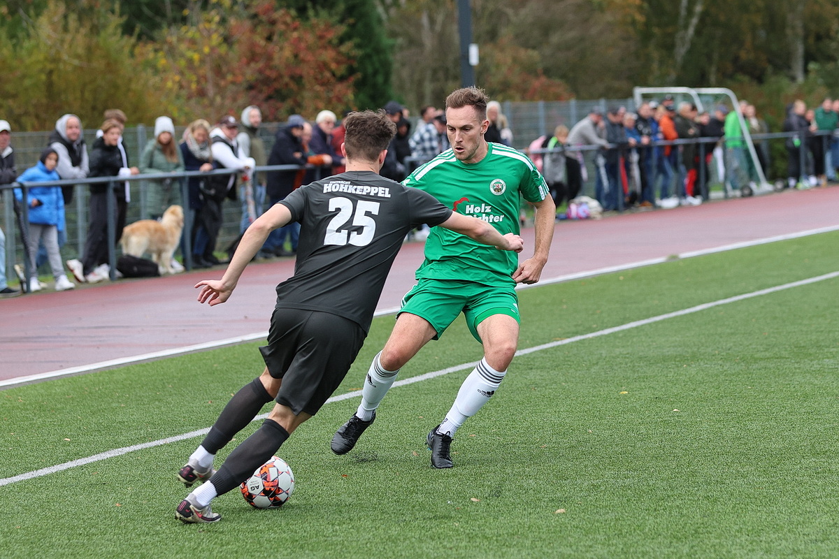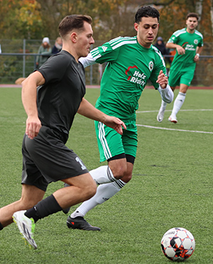 [Bei den Hohkeppelern wirkte Ansgar Pflüger aus dem Kader der Mittelrheinliga-Mannschaft mit (li.), hier behauptet er das Spielgerät gegen Marius Mukherjee.]