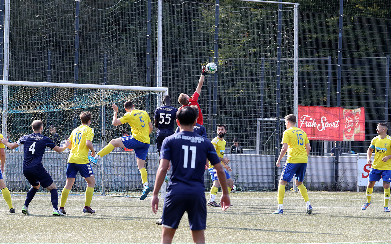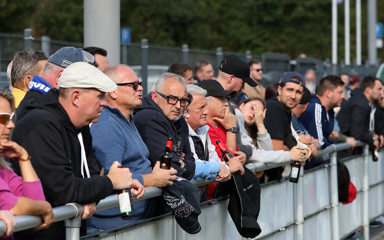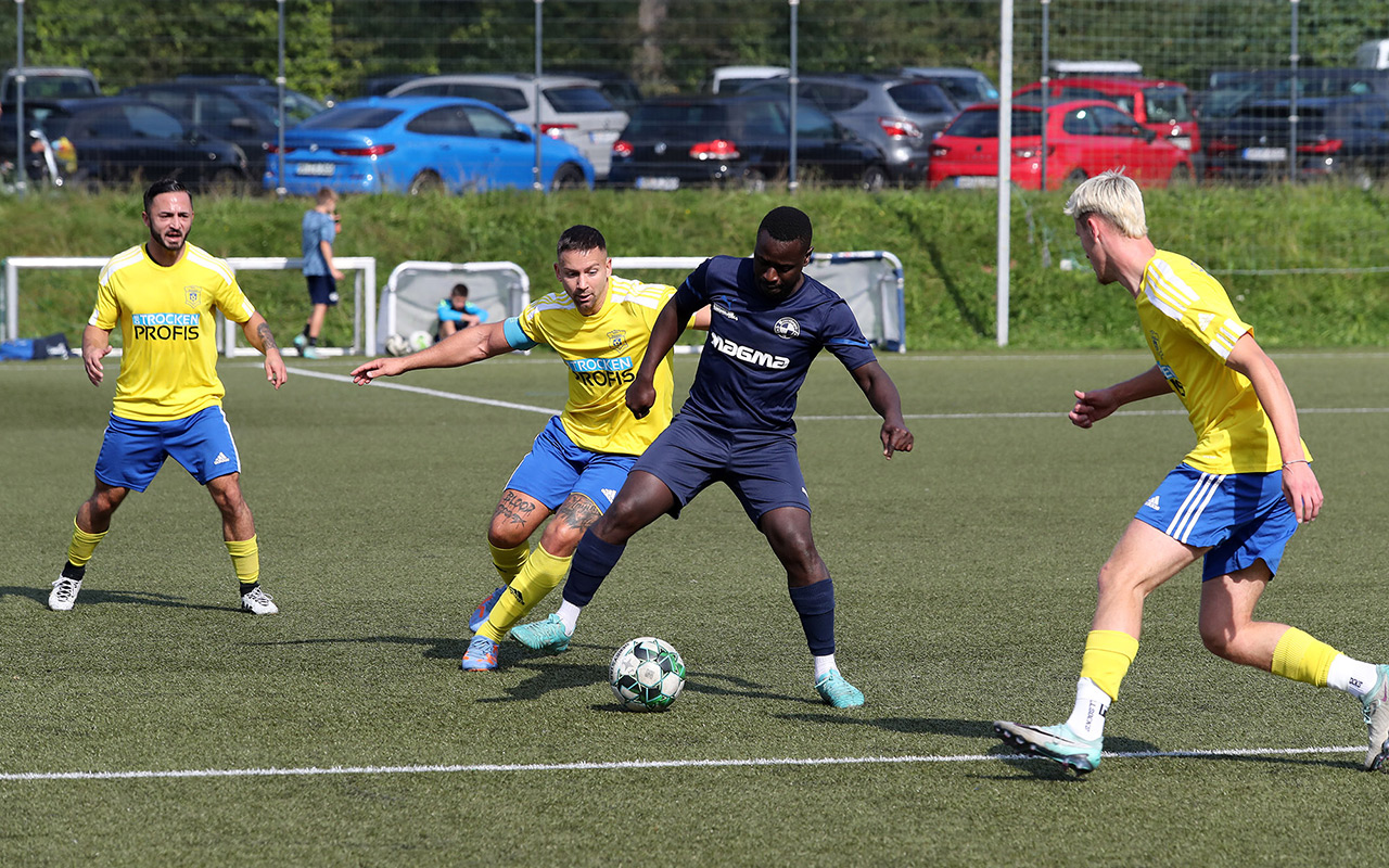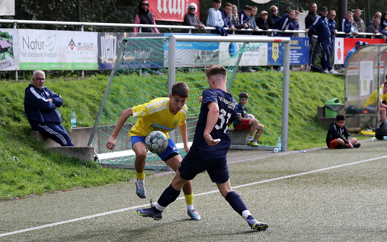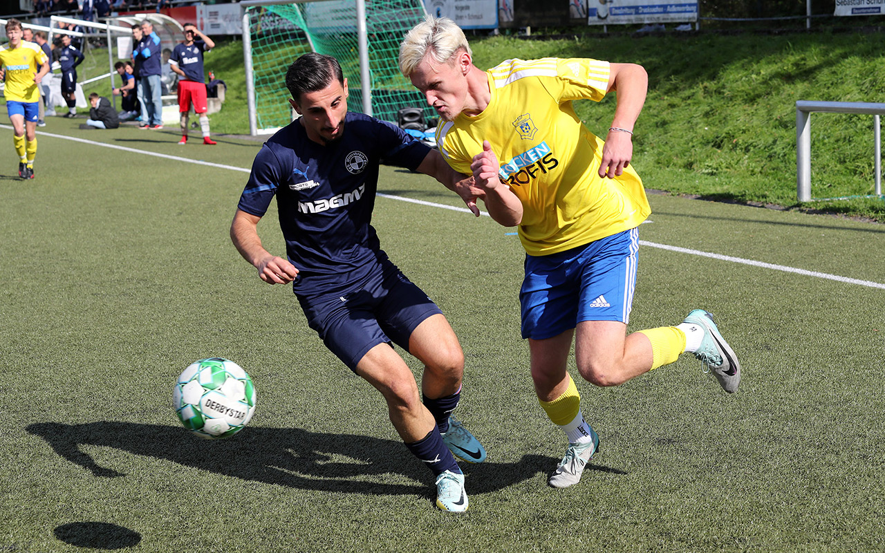 Im Topspiel des Tages gaben die Derschlager erstmals Punkte ab. Und das denkbar unglücklich. Der Tabellenführer legte früh vor: Nach einem Steilpass auf Waldemar Kilb musste der nur noch querlegen und Dominic Hausmann schob locker zur Führung ein. „Bis zu diesem Zeitpunkt waren wir die bessere Mannschaft“, ärgerte sich Gästetrainer Jannick Pfau über den Rückstand, den sein Team kurz nach dem Seitenwechsel ausglich. Paul Haselbach eroberte den Ball und passte auf Moritz Dick, der zum 1:1 einschoss – das erste Liga-Gegentor für die Borussen in dieser Saison. Anschließend boten die Kontrahenten eine Partie auf Augenhöhe, ohne große Höhepunkte, ehe es in der Schlussphase noch einmal spannend wurde. Nach einem Freistoß aus rund 25 Metern ließ Hüttes Torwart Luca Henschel den Ball abprallen, Kilb schaltete am schnellsten und drückte den Ball zum 2:1 für die Borussia über die Linie.