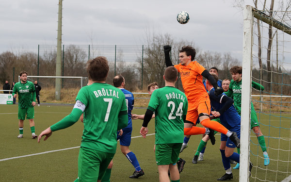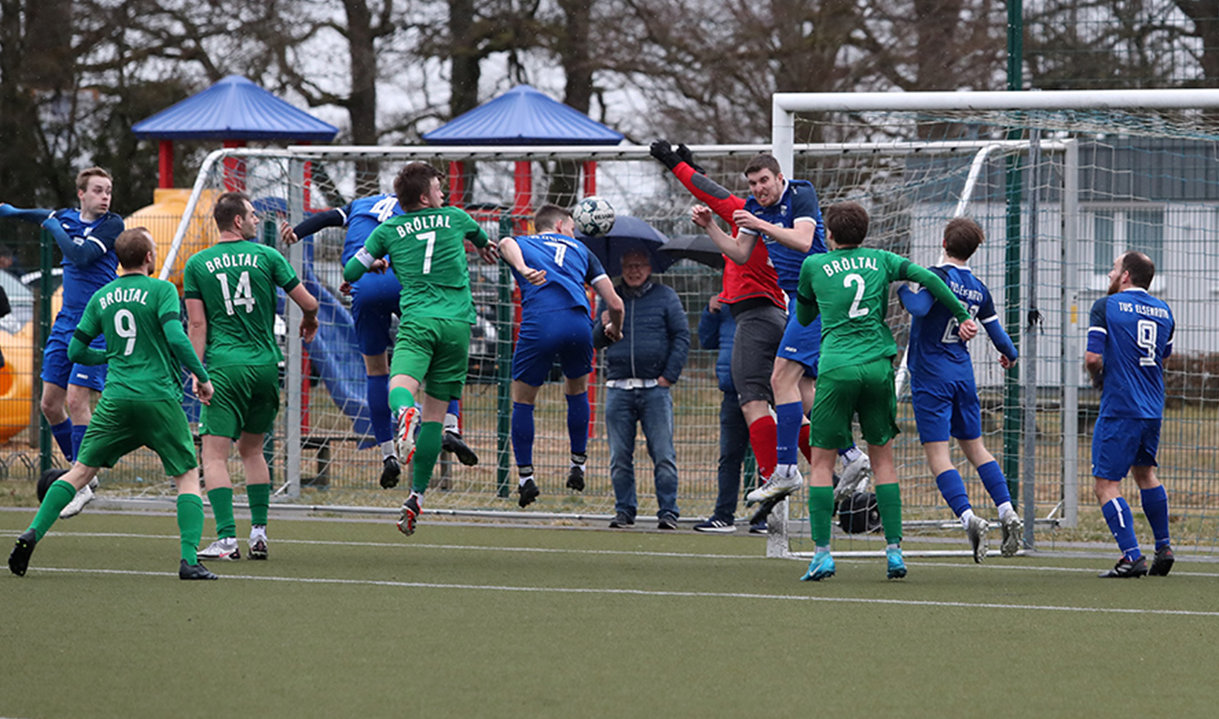[Bröltals Kapitän Aron Jungjohann (vorne re.) erzielte die kuriose Führung, fabrizierte aber auch ein Eigentor.]