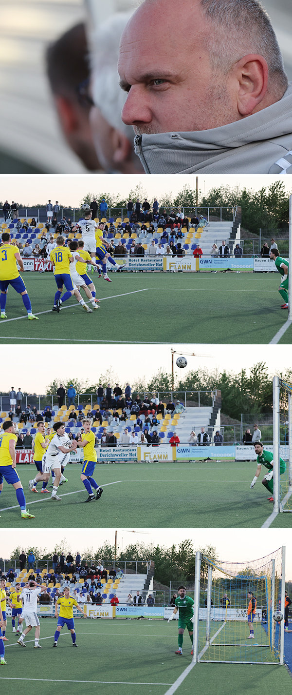 [Nümbrechts Trainer Marcus Voike war nicht immer zufrieden mit seiner Mannschaft ( von oben). Dennis Kania gelang der Siegtreffer. Wiehls Torwart Justin Broy parierte zwischenzeitlich einen Kopfball von Nümbrechts Felix Klein.]