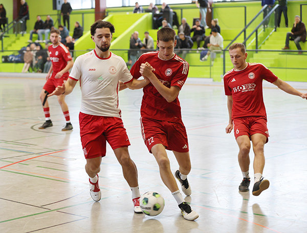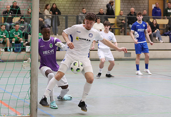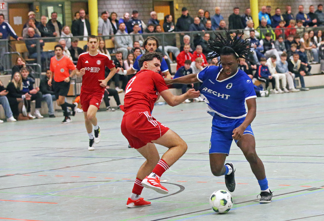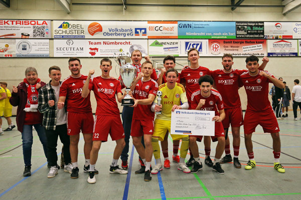 Das Ende der vierten Auflage des müller & klein-Cups hatte eine tragische Komponente. Königsdorfs Noah Kürmali trat im Finale des Nümbrechter Hallenspektakels, das insgesamt zum elften Mal ausgetragen wurde, zum schließlich entscheidenden Neunmeter an und schob den Ball links am Pfosten vorbei. Aufbrausender Jubel im Lager des SV Bergisch Gladbach 09, der schon im Jahr 2023 den Wanderpokal gewann, hängende Köpfe im Lager der Königsdorfer. Kürmali wurde später – verdientermaßen – zum besten Spieler des Turniers gekürt. Acht Tore hatte der TuS-Kapitän erzielt. Zum Turniersieg reichte das aber nicht. Kürmali hatte sein Team im Endspiel mit zwei Treffern in eine komfortable Führung gebracht, Issam Todlih und Jonas Rücker glichen jedoch zum 2:2 aus, ehe es in den Showdown ging.