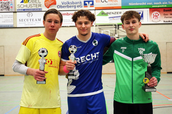 [Bergischs Gladbachs Leon Görgens (v.li.) gewann die Auszeichnung für den besten Torwart, Noah Kürmali von Blau-Weiß Königsdorf wurde bester Spieler und der TuS Homburg-Bröltal erhielt die Trophäe für die fairste Mannschaft. Der mit neun Treffern beste Torschütze des Turniers fehlt auf dem Bild. Ardit Mimini vom SV Bergisch Gladbach 09 musste schnellstens zu einer Hochzeit.]