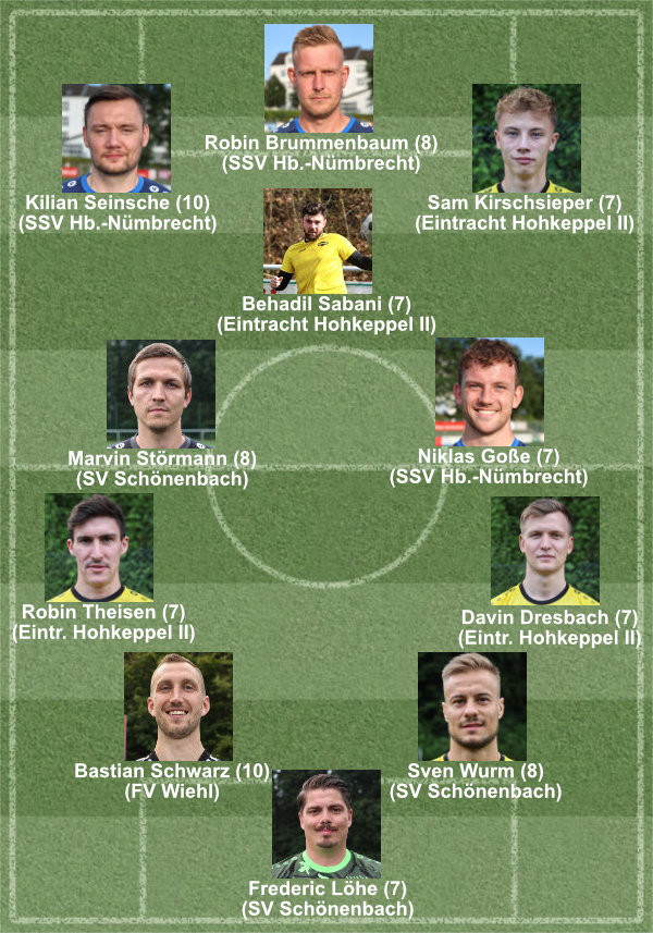 Die Bestenelf der Saison 2024/2025 – wie immer basierend auf den Spieltagsnominierungen der Trainer – setzt sich zu großen Teilen aus Spielern des Landesliga-Aufsteigers Eintracht Hohkeppel II, des SSV Homburg-Nümbrecht und des SV Schönenbach zusammen. Die SVE-Reserve stellt als Bezirksliga-Meister gleich vier Akteure, wobei Behadil Sabani das Kunststück geschafft hat, alle sieben Berufungen in der Rückrunde einzuheimsen. Hinzu kommen von der Hohkeppeler Zweitvertretung Offensivkraft Sam Kirschsieper, die Allzweckwaffe auf der linken Seite, Robin Theisen, sowie Davin Dresbach, der sowohl in der Innen- als auch in der Außenverteidigung spielte.
