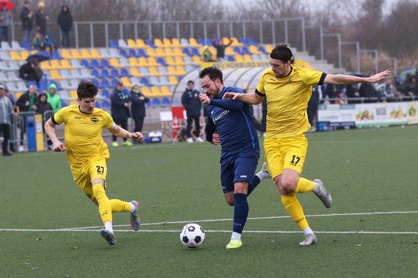 [Joscha Trommler (hier im Zweikampf mit Robin Theisen und Matti Fiedler) hatte den 1:1-Ausgleich schon vor der Pause auf dem Fuß.]