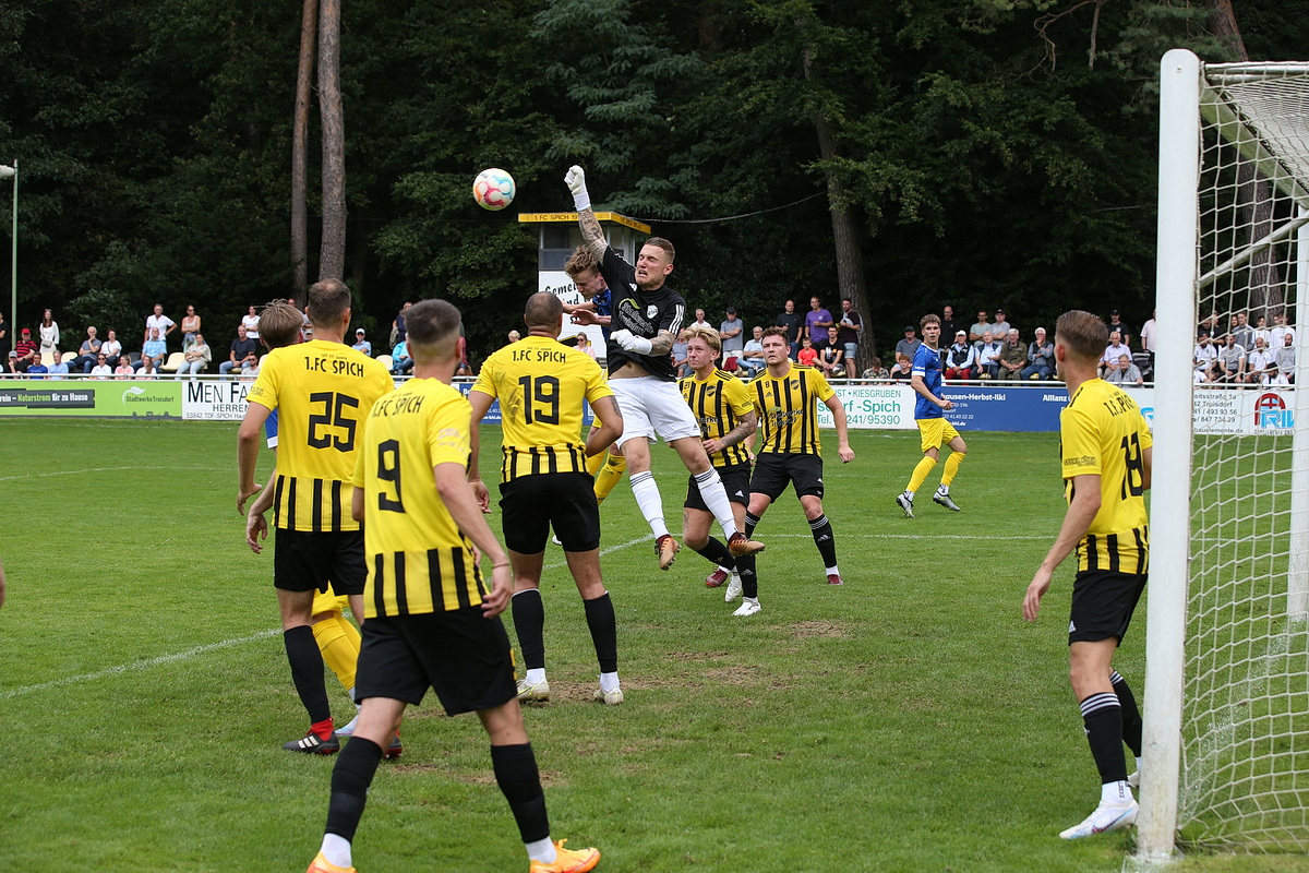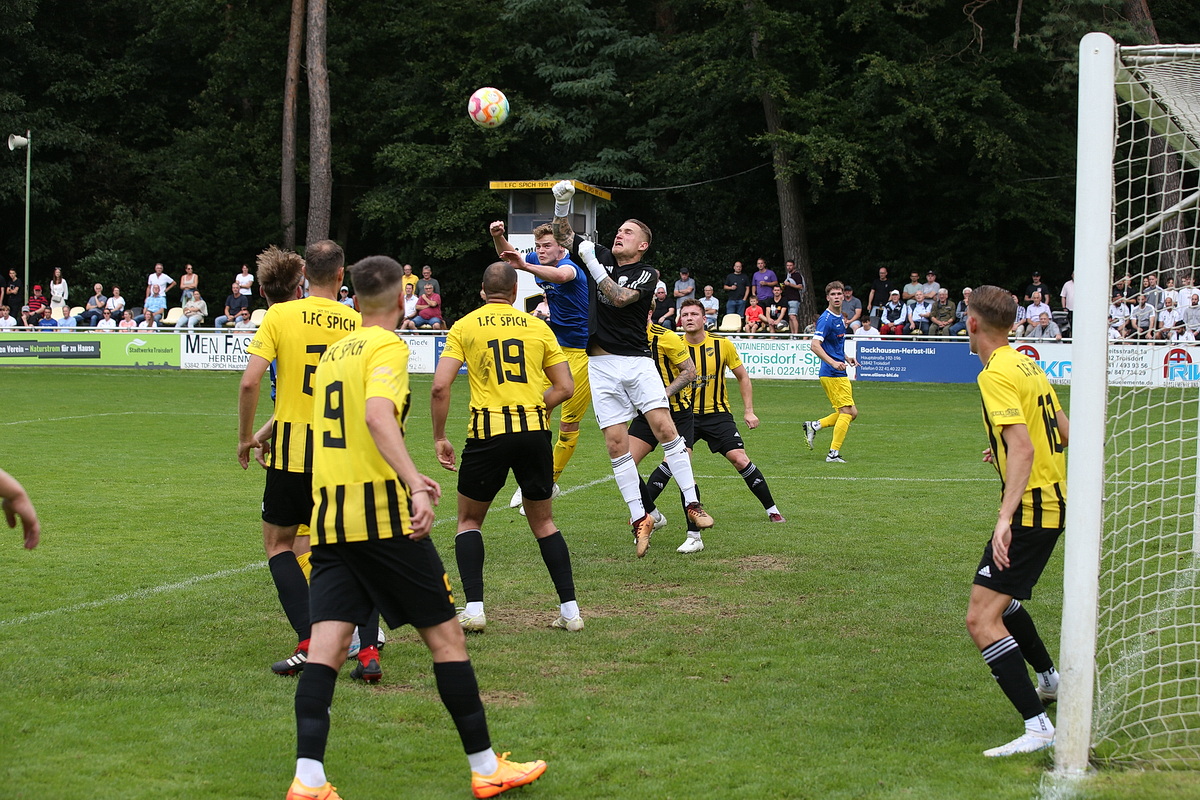 Für die Spicher, die sich abgesehen von den beiden Auftaktchancen meist gut gestaffelt hinter der Mittellinie formierten und auf die Gäste warteten, war der Gegentreffer der Startschuss zu mehr Engagement. Erneut war es Kirst, der freigespielt wurde, aber knapp das SSV-Tor verfehlte (17.). Wirklich gefährlich wurde es für den SSV aber nicht mehr vor der Pause. Die Gäste zeigten nun ihre Qualitäten bei Standards. Niklas Clemens zirkelte einen Freistoß auf Dean-Robin Paes, der den Ball nur hauchdünn mit dem Kopf verpasste. (28.). Nach der anschließenden Ecke war es erneut Paes, der per Kopf zum Abschluss kam, doch am gegnerischen Torwart Dennis Pastoors scheiterte. Den Abpraller schnappte sich Felix Sievers. Von der Grundlinie dribbelte der Neuzugang vom FV Wiehl ins Strafraumzentrum und schob den Ball überlegt ins lange Eck (29.).