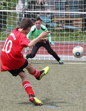 [Der entscheidende Neunmetertreffer im Endspiel für das Gummersbacher Lindengymnasium gegen das Wüllenweber-Gymnasium.]