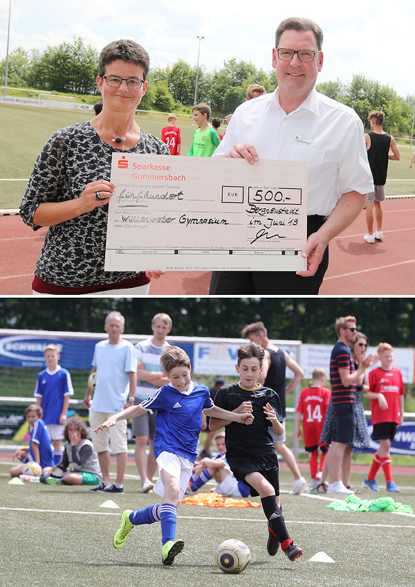 [Zur Unterstützung des Projekts überreichte Stephan Neu von der Sparkasse Gummersbach WWG-Schulleiterin Monika Türpe einen Scheck über 500 € - unten: Spannende Partie zwischen dem Aggertal-Gymnasium Engelskirchen (blau) und der Gesamtschule Derschlag beim Spiel um Platz drei.]