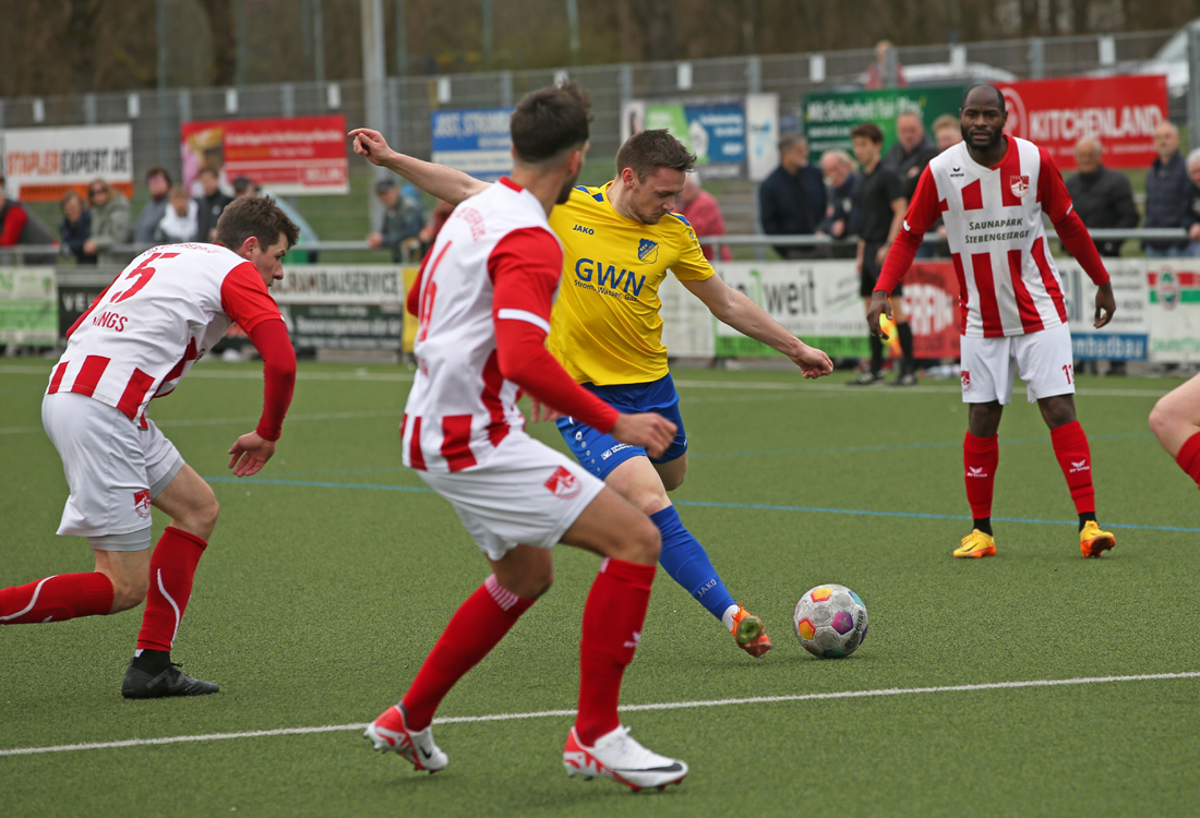 „Danach waren wir zu gierig“, ärgerte sich Reisewitz über die kopflose Phase seiner Mannschaft nur zwei Minuten später. Nach einem Freistoß stand plötzlich Marc Banko frei, der prompt zum Anschluss traf (62.). Danach drehten beide Teams noch einmal auf und es entwickelte sich ein körperlich intensives Duell mit vielen harten Zweikämpfen. Einmal übertrieben es die Gäste damit. Nümbrechts Julian Opitz war in die Box eingedrungen, suchte und fand den Körperkontakt und ging zu Boden. Den fälligen Elfmeter versenkte Kilian Seinsche mit einem satten Schuss zum 3:1 (75.). Aber erneut gaben sich die Platzherren nicht zufrieden und drängten auf das vierte Tor. Der eingewechselte Dean-Robin Paes scheiterte an Torwart Klein und bereitete wenig später auch noch eine Chance des ebenfalls neu gekommenen Marc Engelbert vor, der mit seinem Abschluss nur hauchzart das Tor verfehlte.