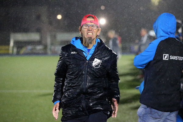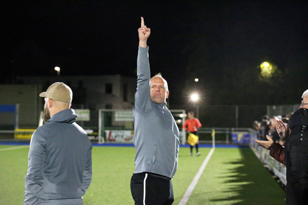 [Wiehls Trainer Sascha Mühlmann triumphierend nach dem zweiten verwandelten Elfmeter von Jan Peters zum 2:0.]