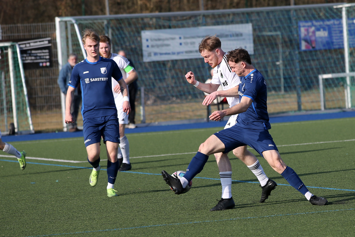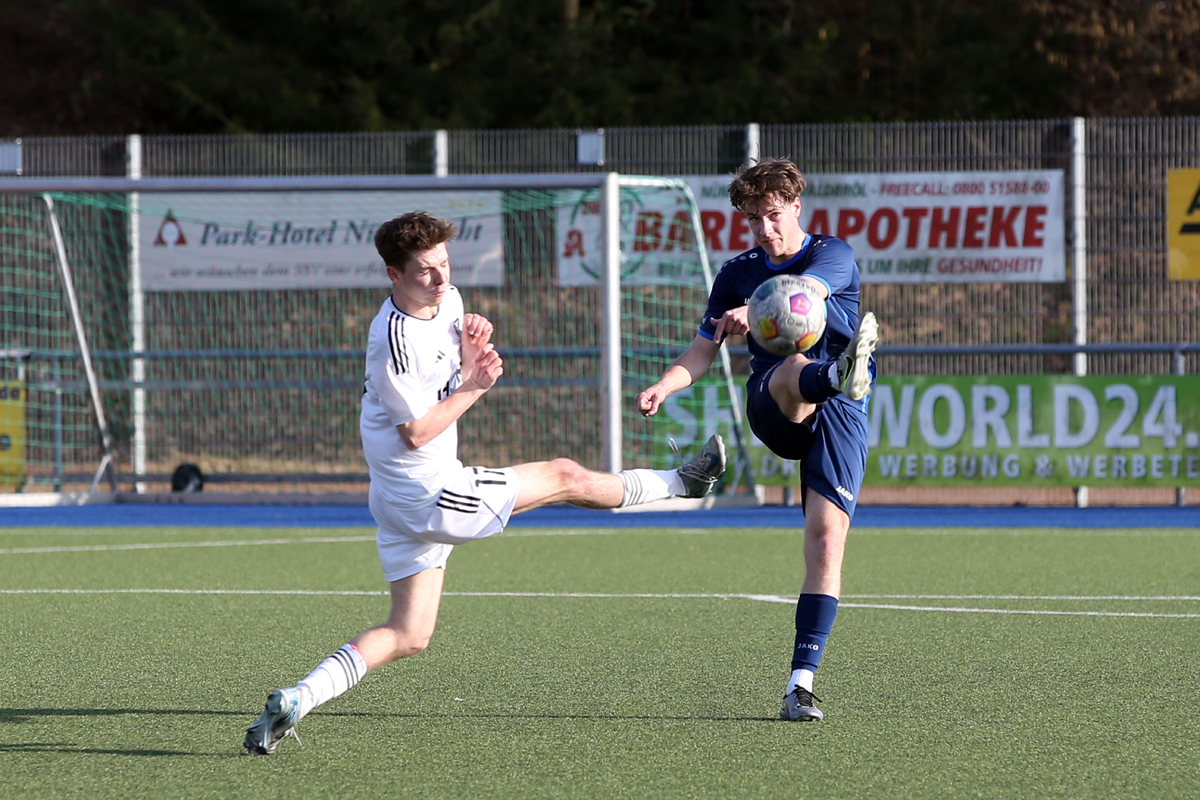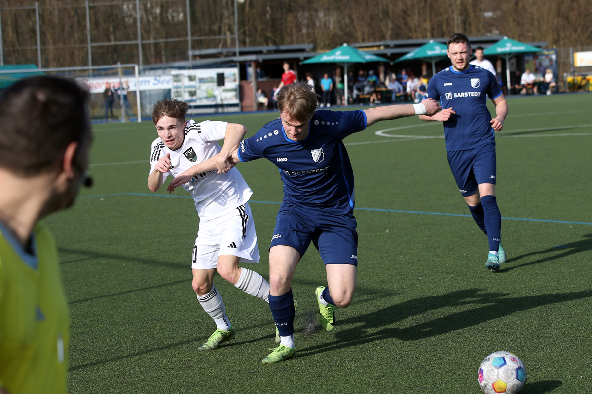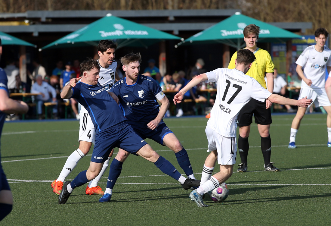 Den ersten Treffer bereiteten die Hausherren über die rechte Seite vor. Felix Klein hatte sich durchgetankt und schlug eine scharfe, flache Hereingabe ins Strafraumzentrum, wo rund sechs Meter vor dem Tor Robin Brummenbaum den Ball zum 1:0 in die Maschen drückte. „Wir machen mit der ersten ordentlichen Aktion das Tor, schaffen es dann aber nicht, das Tempo hochzuhalten und den Gegner ans Laufen zu bringen“, sagte Reisewitz, dessen Team auch Chancen gegen sich hinnehmen musste. Nach einem gelungenen Dribbling steckte Seelscheids Moritz Tel den Ball auf Niklas Krämer durch, Julian Schoepe im SSV-Tor hielt den folgenden Schuss jedoch glänzend (26.). Bis zur Pause sollte es die letzte nennenswerte Aktion bleiben.
