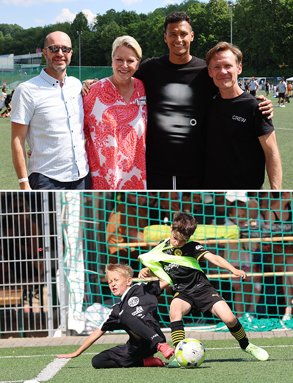 [Andreas Günther (v.li.) und Bettina Hühn vom Vorstand „Helfende Hände Oberberg“, FC-Profi Davie Selke und Heinrich Peters (oberes Foto); der Kicker des FC Borussia Derschlag gibt im Zweikampf mit einem BVB-Spieler alles.]