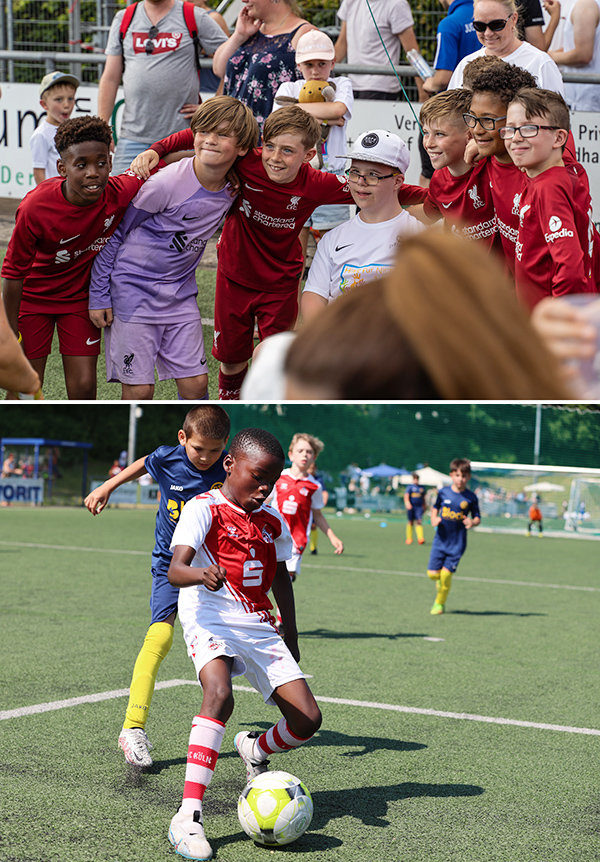 [Der mit dem Down-Syndrom geborene und früher an Leukämie erkrankte Jannes (12 Jahre) mit den Spielern des FC Liverpool (oberes Bild); das Duell RS 19 Waldbröl (blaue Trikots) gegen den 1. FC Köln (unteres Bild).]