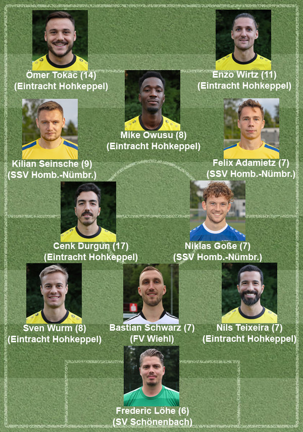 In der Landesliga erreichte der SSV Homburg-Nümbrecht den fünften Platz – vor allem dank einer starken Rückrunde. In dieser drehte auch Kilian Seinsche richtig auf. Sechs seiner neun Nominierungen heimste er in der zweiten Saisonhälfte ein. Mit Felix Adamietz, dem offensiv ausgerichteten Rechtsverteidiger, sowie Niklas Goße, den Coach Torsten Reisewitz zum Sechser beziehungsweise Achter umschulte, sind zwei weitere SSV-Akteure in der Bestenelf vertreten.