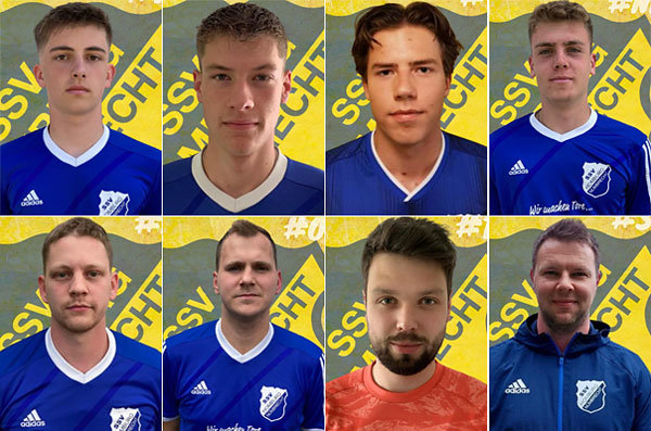 [Die neuen Kicker (von oben li. nach unten re.): Moritz Strathaus, Moritz Becker, Til Steinmetz, Nikolas Mennecken, Robin Kamp, Otto Fehl und Thomas Bernhardt sowie Teammanager Simon Wenz.]