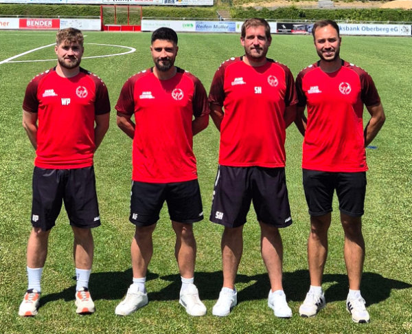 [Foto: SV Morsbach --- Das Trainerteam um Patrick Wolf, Sebastian Huhn und Gabriel Joos begrüßt Neuzugang Alejandro Frias-Kita.]