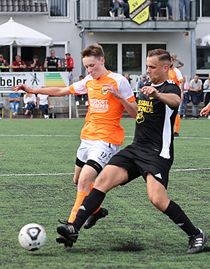 Die Wiehler starteten gut ins Spiel. Florian Liebelt (10.) und Albin Krasniqi (15.). schossen den Ball knapp über die Latte bzw. vorbei am Pfosten. Ein abgefälschter Schuss von Marvin Bollow fand dann etwas glücklich den Weg ins Tor (20.). Mühlmann: „Die Führung war zu diesem Zeitpunkt verdient.“ Nach 30 Minuten verloren die Gäste dann den Faden, war Hangelar per Doppelschlag für sich nutzen konnte. Zunächst schlugen die Gäste nach einem eigentlich schon geklärten Ball zu, der direkt vor den Füßen eines VfR-Spielers landete.