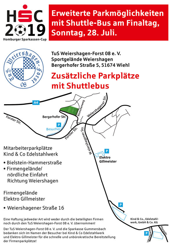 Zum Finale des Sparkassen-Cups am Sonntag, 28. Juli, erwarten die Veranstalter nach der bisherigen Resonanz auf die Vorrundenspiele einen großen Andrang. Aus diesem Grund werden drei zusätzliche Parkplätze, die alle von einem Shuttlebus angefahren werden, angeboten. Die beiden Mitarbeiterparkplätze der Firma Kind & Co. (nördliche Einfahrt an der Weiershagener Straße und Bielstein-Hammerstraße), sowie das Firmengelände von Elektro Gillmeister (Weiershagener Straße 16), stehen den Besuchern am Sonntag zur Verfügung. Der Shuttledienst verkehrt ab 12:30 Uhr zwischen den Parkplätzen und dem Sportgelände. ![]()