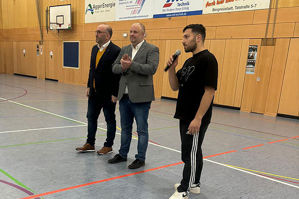[SSV-Jugendleiter Hakan Yagci (re.) eröffnete das Turnierwochenende mit Haupsponsor Hüseyin Aksoy (li.) und Bürgermeister Mathias Thul.]