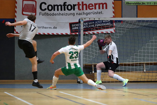 [Der Kiersper Keeper wirft sich gegen den Frielingsdorfer Jonathan Schmidt ins Getümmel.]