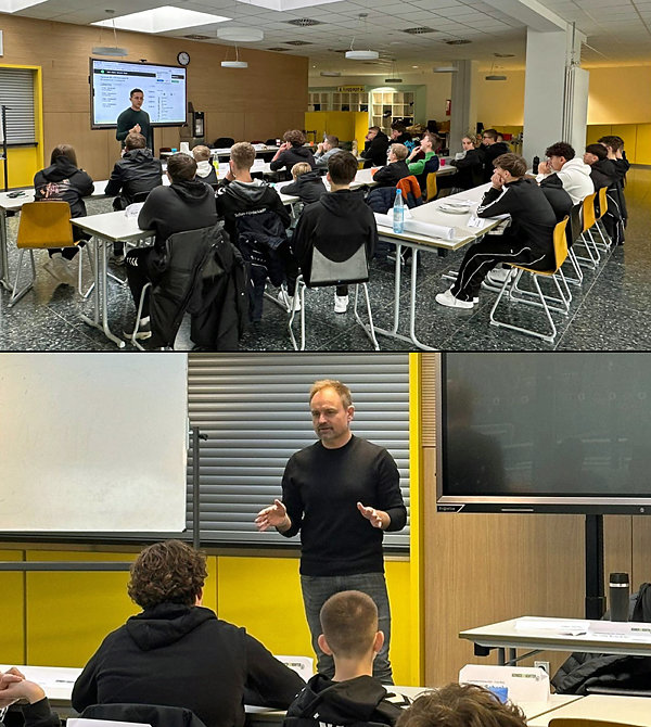 Mit Frederick Assmuth (Bundesliga-Schiedsrichterassistent), und Nico Fuchs, der in der 2. Bundesliga an der Seitenlinie unterwegs ist, kamen zwei professionelle Unparteiische zu Besuch und gaben den Teilnehmenden einen Einblick in den Spieltagsablauf sowie in den Schiri-Funk auf dem Platz. Zudem fuhren die jungen Schiedsrichter zum Kreispokalspiel zwischen Hoffnungsthal und Rösrath, das sie anschließend gemeinsam analysierten.