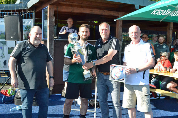 [Alfons Arnoldy (v.li.), Freizeit- und Breitensportbeauftragter des Fußballkreises Berg, der Kreisvorsitzende Jürgen Liehn und Geschäftsführer Ralf Zimmermann übergaben den Siegerpokal an Lindlars Kapitän Martin Reif (2.v.li.).]